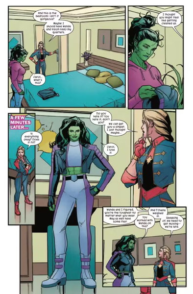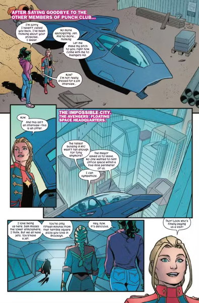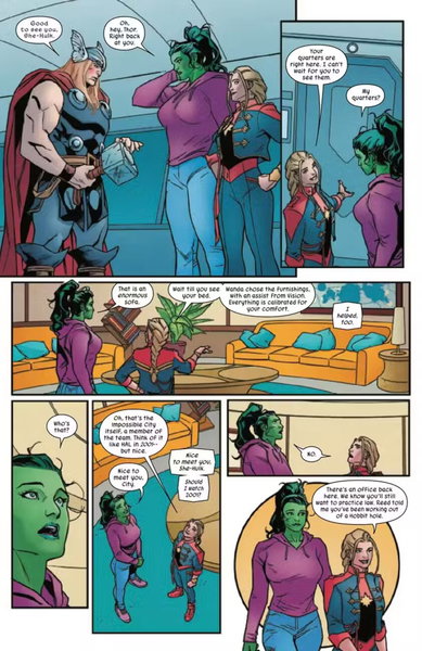 En una vista previa del cómic Sensational She-Hulk #9, She-Hulk es invitada a la base de los Vengadores, la nave dimensional inteligente que ha sido conocida como Impossibe City. En esta situación, Capitana Marvel muestra a Jennifer Walters los alrededores de la zona, mientras la regala un nuevo traje que ha sido diseñado por ella misma, la Bruja Escarlata y T'Challa para celebrar la ocasión.